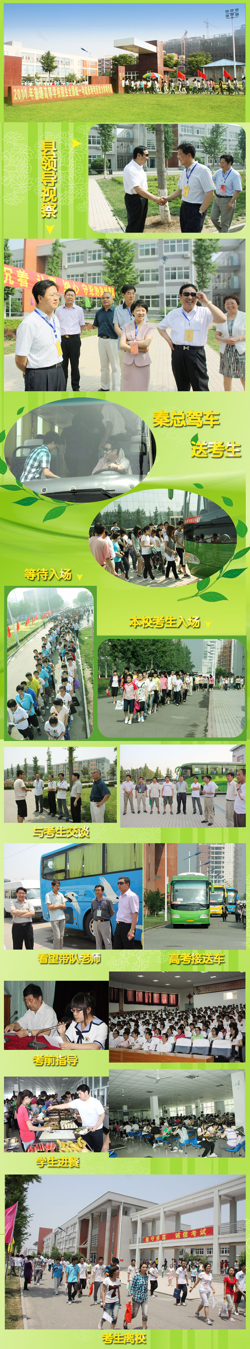 2011年,我校有近千名高三畢業(yè)生參加高考。為了讓我校考生以輕松平和的心態(tài)和全力以赴的精神應(yīng)對高考,學(xué)校為學(xué)生做到了全方位的周到細(xì)致的考前考中服務(wù):為全體高三考生免費提供了花樣多多、科學(xué)搭配、美味可口的自助餐;安排了寬敞舒適的接送車輛;安排了經(jīng)驗豐富、耐心細(xì)致的帶隊教師,全程負(fù)責(zé)考試期間的學(xué)生管理;高中部對考生進(jìn)行了細(xì)致入微、科學(xué)有效的考前動員和考中心理疏導(dǎo),制定了細(xì)化到每分每秒的考生作息計劃……考試期間,集團(tuán)公司秦自力、王香蓮、劉守軒、潘丙河等領(lǐng)導(dǎo)親臨校園,指導(dǎo)高考組織工作。秦董事長憑其嫻熟的駕駛技術(shù),親自駕車送考生上考場,他的仁厚博愛的胸懷,睿智堅毅的性格,幽默風(fēng)趣的話語,讓所有考生十分感動,精神倍增。