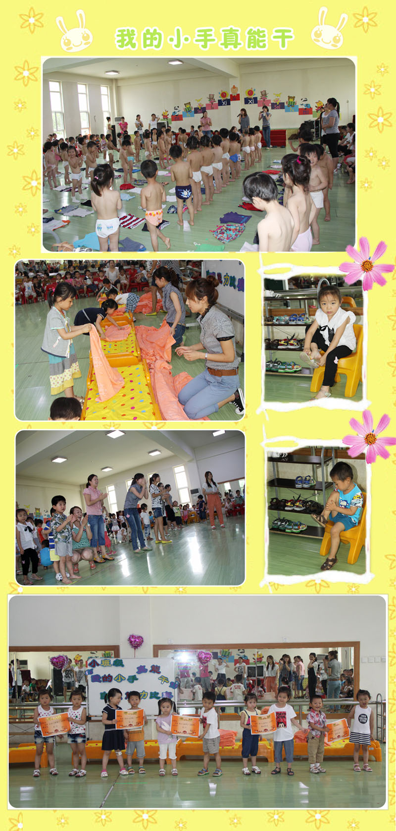 為提高幼兒自我服務(wù)的意識(shí)與能力, 幼兒園小班級(jí)于近日在音體室舉行了“我的小手真能干”自理能力比賽。