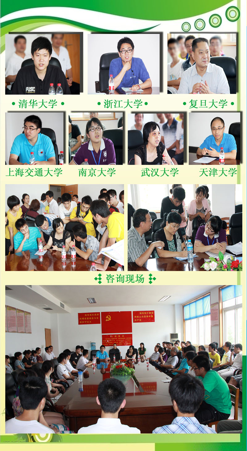 在2011年高考成績(jī)揭曉之后,清華大學(xué)、浙江大學(xué)、復(fù)旦大學(xué)、上海交通大學(xué)、南京大學(xué)、武漢大學(xué)、天津大學(xué)等國(guó)內(nèi)知名高校的河南招生組負(fù)責(zé)人相繼來(lái)到我校,開展2011年高校招生咨詢活動(dòng)。在活動(dòng)中,他們分別向?qū)W生、家長(zhǎng)介紹了學(xué)校的辦學(xué)特色、招生計(jì)劃、優(yōu)秀專業(yè)發(fā)展前景及就業(yè)情況等,并就考生及家長(zhǎng)所關(guān)注的問(wèn)題一一解答,并提供相關(guān)招生資料。