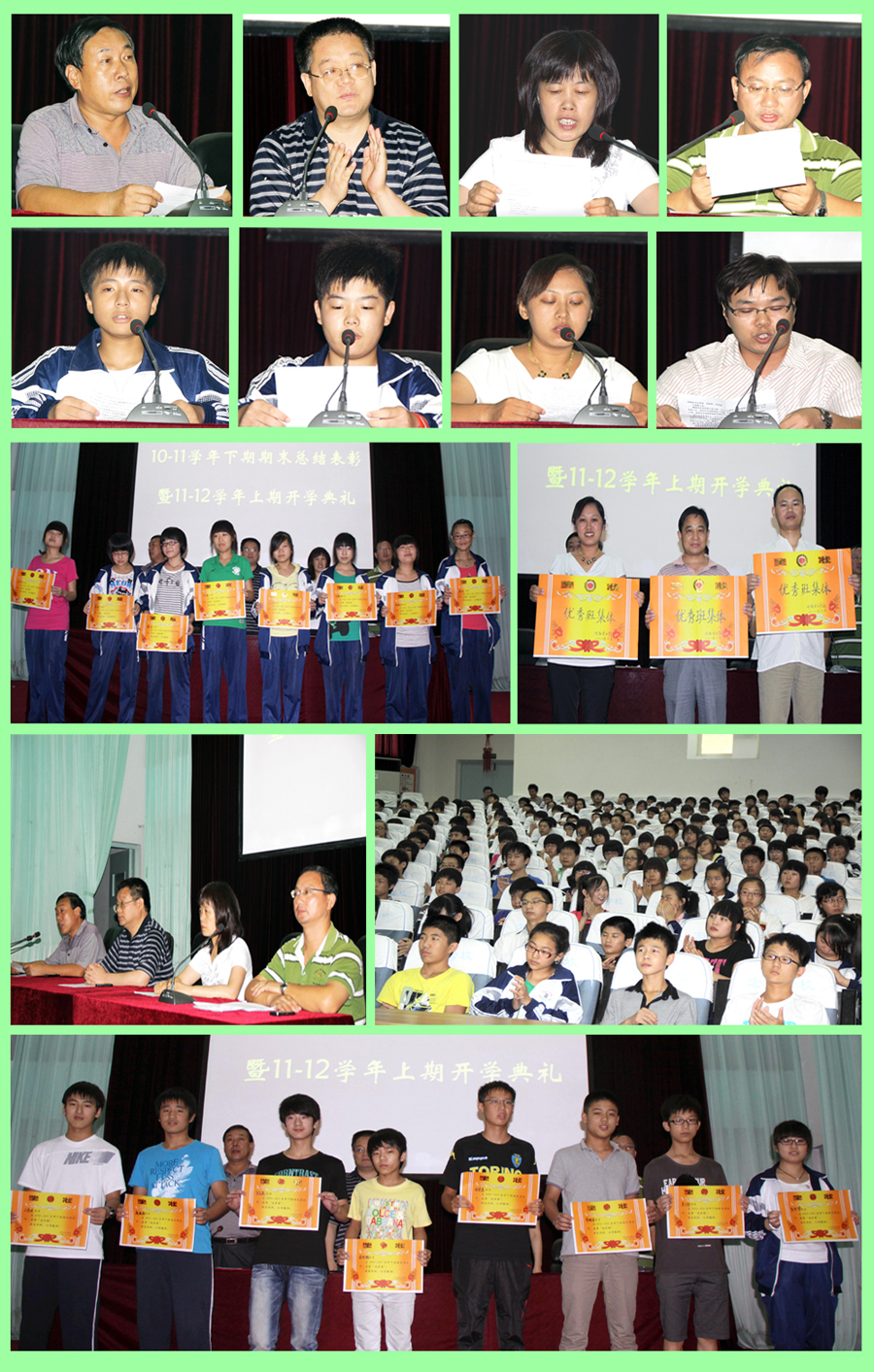 8月3日晚,初中部在報告廳舉行了九年級10-11學(xué)年下期期末總結(jié)表彰暨11-12學(xué)年上期開學(xué)典禮。副總校長兼初中部校長王志甫、教導(dǎo)處主任白新平、副主任趙麗、生活處主任蔡忠民出席表彰大會。