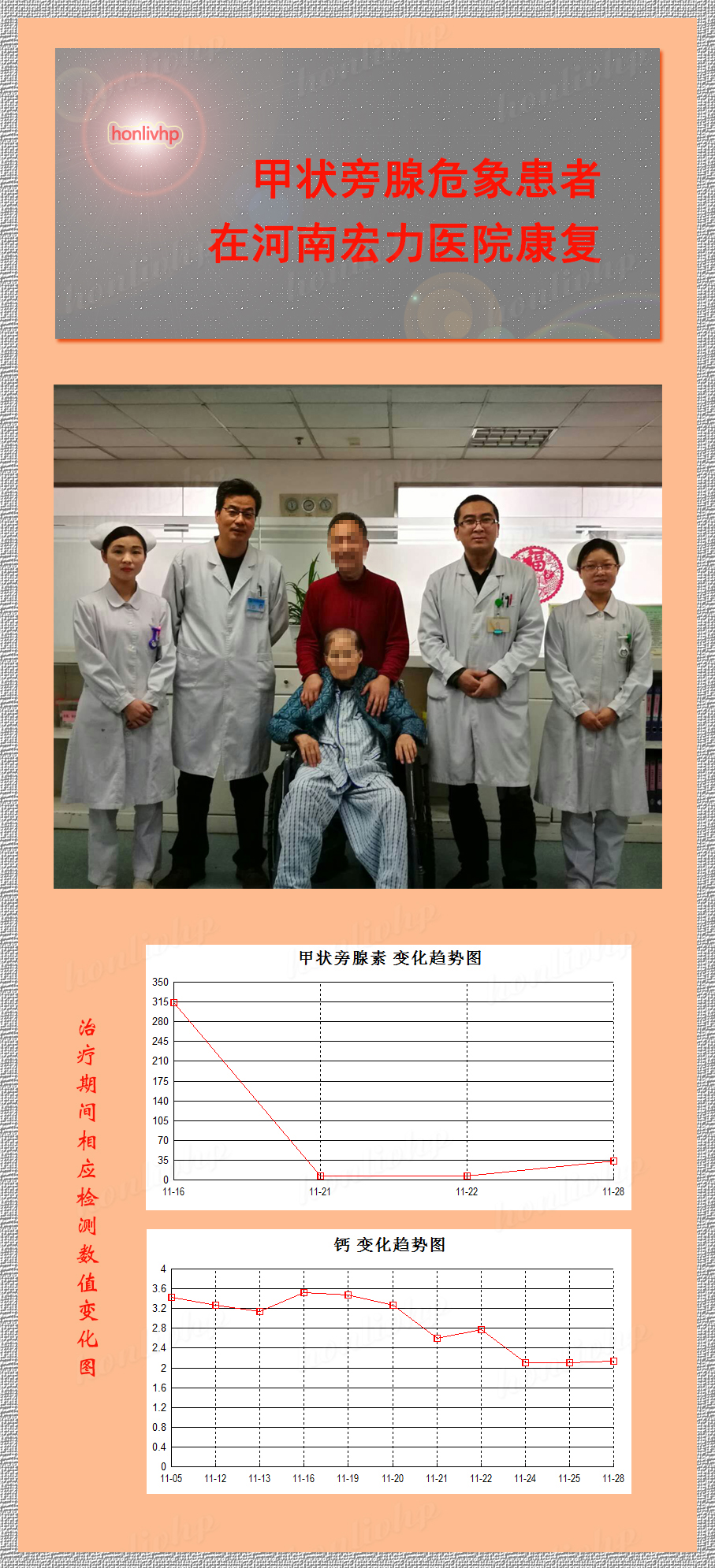 近日,一例甲狀旁腺危象患者在河南宏力醫(yī)院康復(fù)出院。81歲高齡患者云某因摔傷后并咳嗽、咳痰來(lái)我院呼吸科就診,經(jīng)治療后咳嗽、咳痰癥狀明顯好轉(zhuǎn),但患者外傷后反應(yīng)遲鈍、精神萎靡、睡眠多、言語(yǔ)不清、不能行走、不能進(jìn)食,并伴有惡心、嘔吐現(xiàn)象,只能靠胃管進(jìn)食,且癥狀逐漸加重。血鈣檢查結(jié)果明顯高于正常值(3.26mmol/l,正常值2.1-2.7mmol/l),內(nèi)分泌科會(huì)診未排除甲狀旁腺疾病。急查甲狀旁腺素結(jié)果較高(313.4pg/ml,正常值12-88pg/ml),彩超顯示其甲狀腺右葉中部背側(cè)實(shí)性為主混合性占位,甲乳血管外科診斷:1.甲旁腺瘤并甲狀旁腺功能亢進(jìn)癥;2.甲狀旁腺危象,需要急診手術(shù)治療,否則會(huì)出現(xiàn)生命危險(xiǎn)。