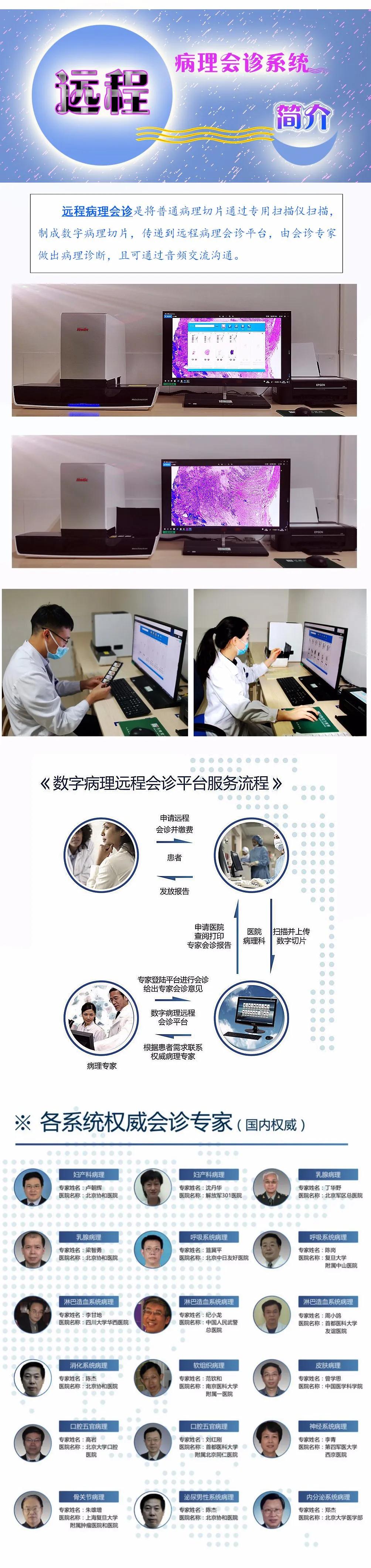 部分患者及其家屬或臨床醫(yī)師因患者病情重大或器官切除時(shí),需要獲取權(quán)威的病理專(zhuān)家做出診斷來(lái)解除心理障礙,如果患者親自帶著病理切片外出到北京、上海等大醫(yī)院進(jìn)行會(huì)診,則費(fèi)時(shí)費(fèi)力、手續(xù)繁瑣、且花費(fèi)很大,還不一定能選擇適宜的專(zhuān)家出具病理診斷報(bào)告,現(xiàn)通過(guò)病理遠(yuǎn)程會(huì)診就能輕而易舉解決以上問(wèn)題,獲得國(guó)內(nèi)權(quán)威專(zhuān)家的診斷。