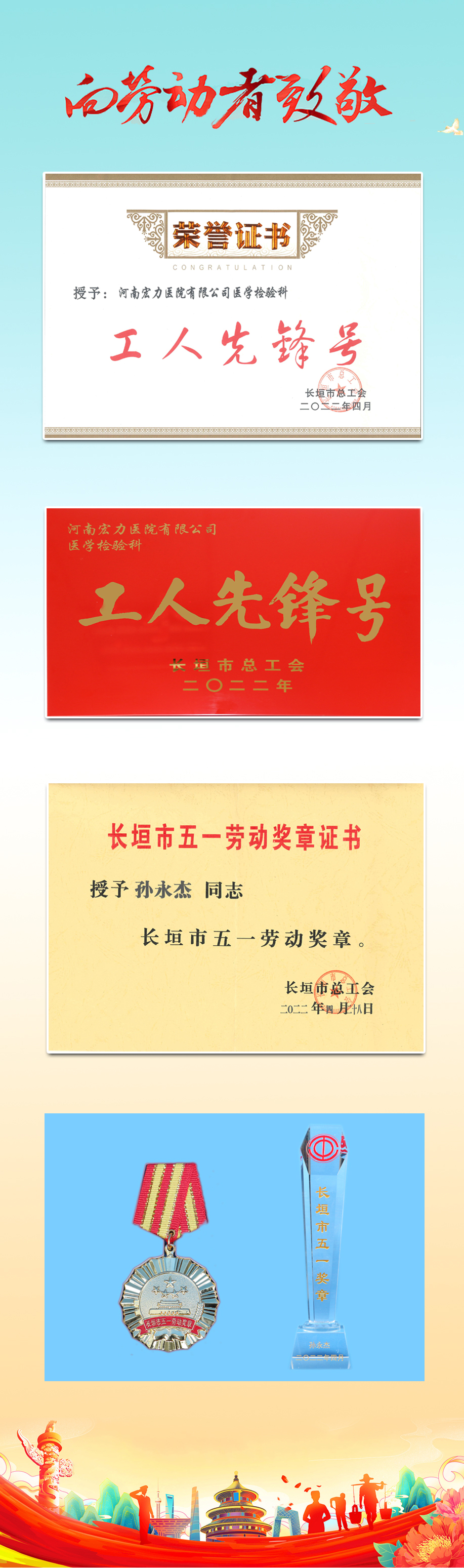河南宏力醫(yī)院醫(yī)學(xué)檢驗(yàn)科、員工孫永杰分別榮獲“工人先鋒號(hào)”、“長(zhǎng)垣市五一勞動(dòng)獎(jiǎng)?wù)隆睒s譽(yù)稱號(hào)